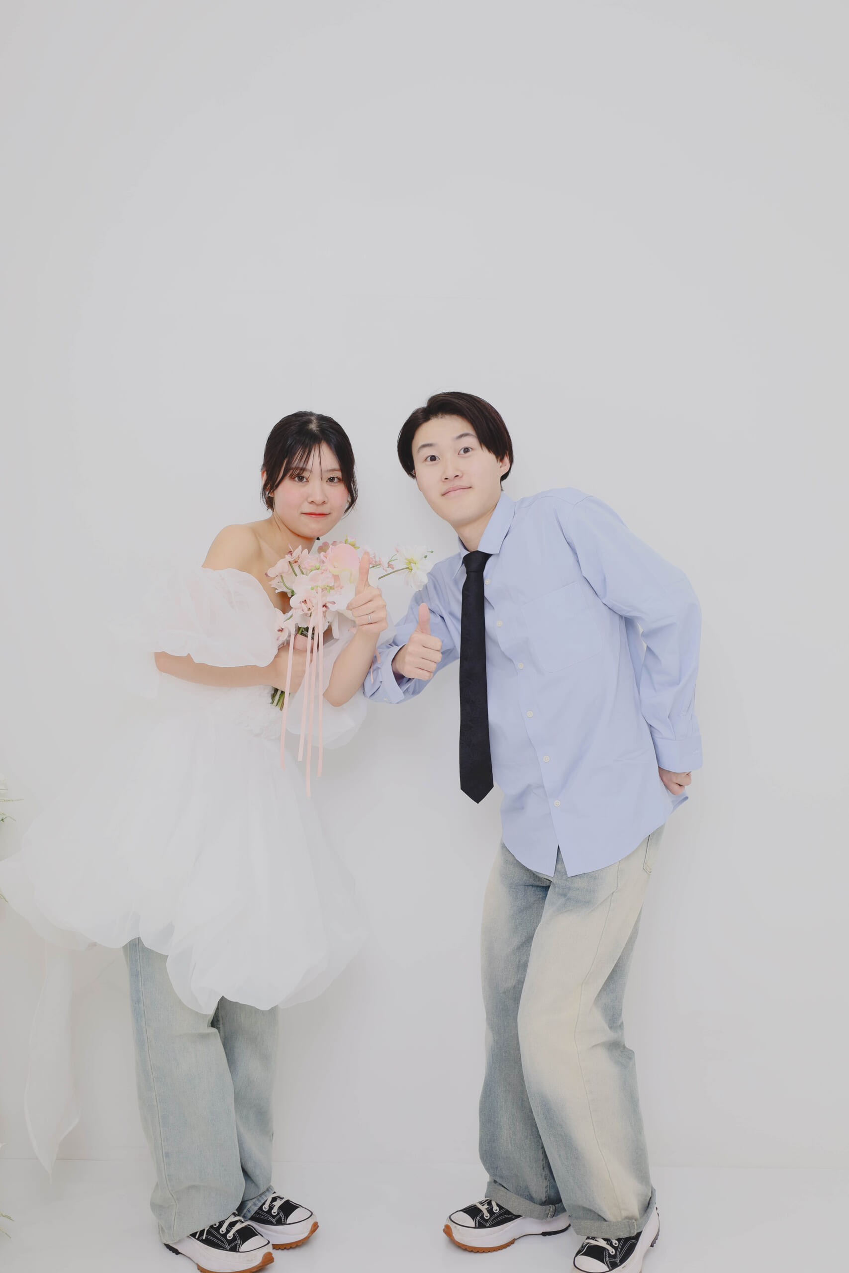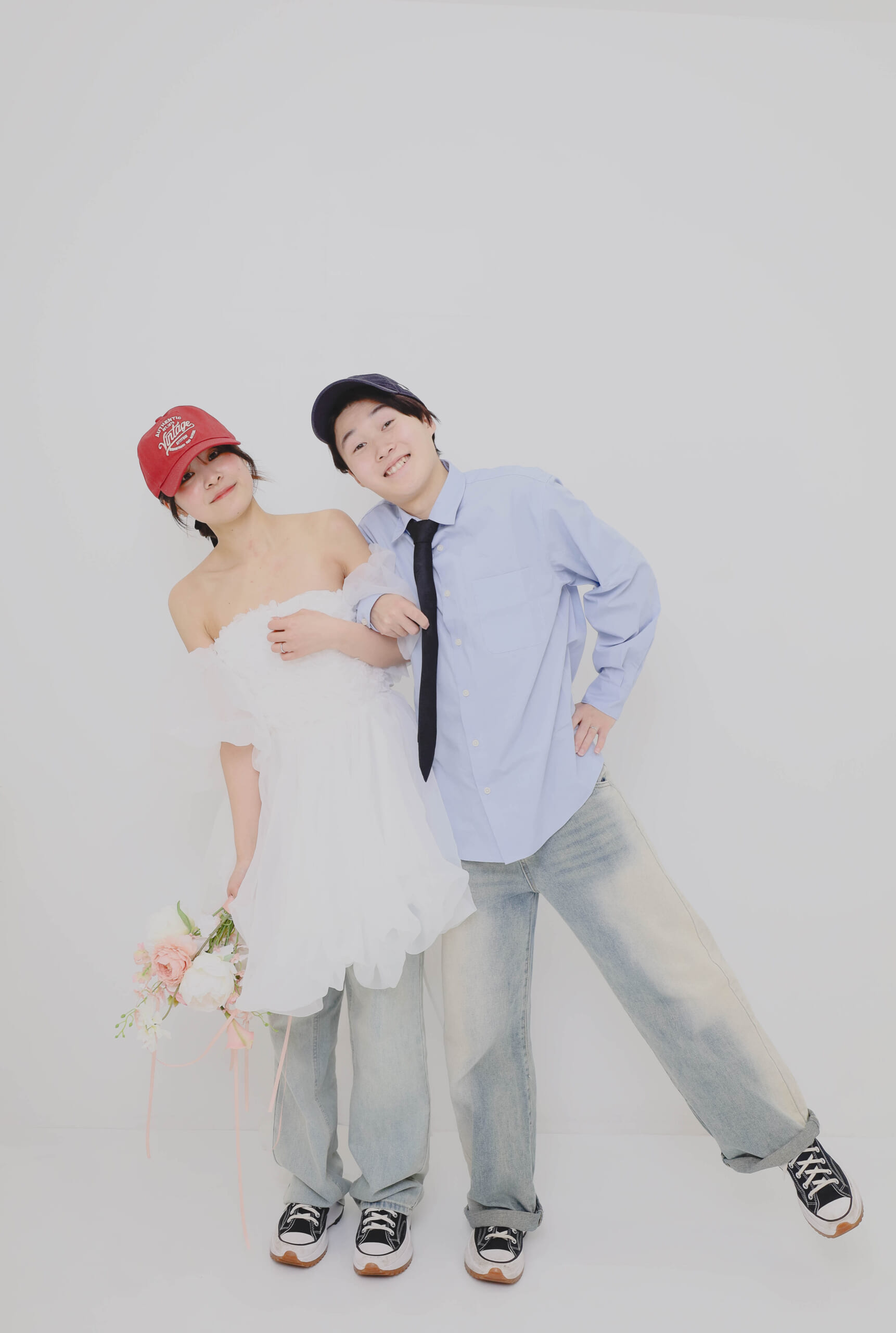 ご新婦さまの持ち込みミニドレスに、おそろいのデニムやシューズ、キャップがカジュアルでも特別感がありかわいいです🧡